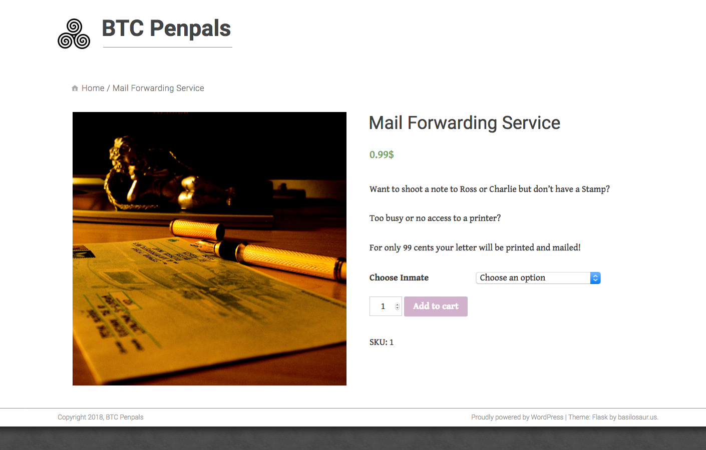 I wanted to create a service to allow people the ability to communicate with loved ones in jail or prison using bitcoin. The service sits behind a simple wordpress site and woocommerce plugin and can be used to mail corresondance to any inmate in the world